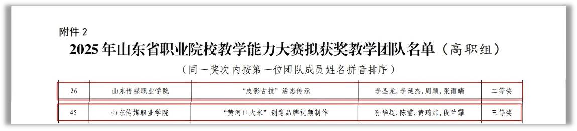 近日,2025年山东省职业院校教学能力大赛获奖名单正式公布。学院选派的两支教师团队凭借扎实的教学功底、创新的教学设计和出色的现场表现,分获二等奖1项、三等奖1项,充分展现了学院教师优秀的教学风采与学院高水平的教学质量。